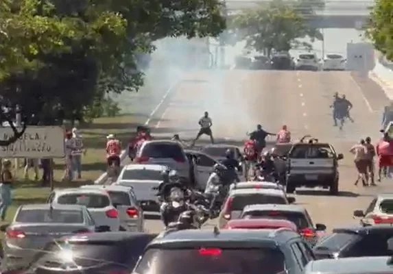 Nos vídeos, é possível observar que foram usadas bombas durante o confronto, no qual aumentou a tensão no local.