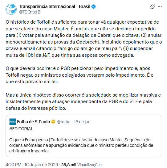 A Transparência Internacional – Brasil afirmou que o histórico do ministro Dias Toffoli, do STF, indica baixa chance de ele se declarar impedido no inquérito sobre o Banco Master.