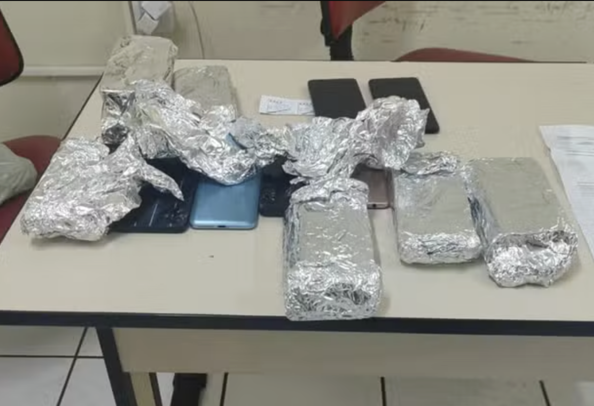A suspeita foi convidada a acompanhar os policiais até o posto policial. Durante revista na bolsa dela, foram encontrados diversos aparelhos celulares embalados em papel alumínio. Ao todo, 43 celulares de diferentes marcas e modelos foram apreendidos.